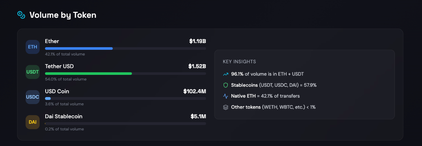 During this period, addresses in the dataset moved $2.81B across 89,660 transactions, interacting with 10,978 counterparties. The flow is highly concentrated in the assets that dominate on-chain settlement: USDT (~$1.52B) and ETH (~$1.19B) account for the vast majority of volume, followed by USDC (~$102.4M) and DAI (~$5.1M).